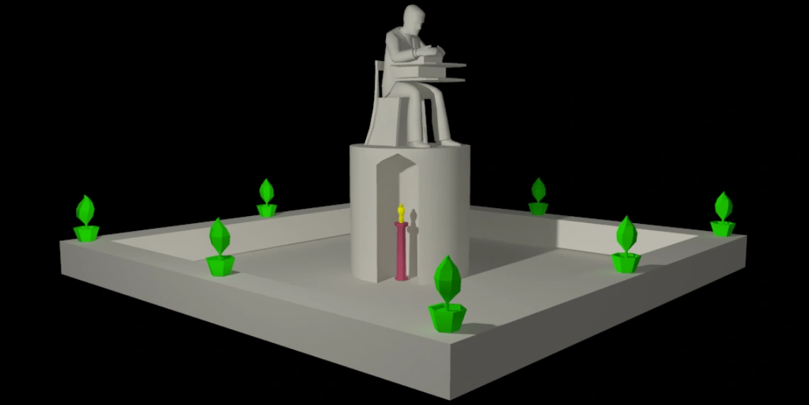 Courtyard (often called Courtyard I to disambiguate it from its sibling Courtyard II) is a map in SpyParty. The distinctive feature of the Courtyard maps is the fact that the sniper can move continuously around the perimeter. The sniper also has a nearly complete view of the map, save for the area obscured by the central pedestal. The chief feature that distinguishes this map from Courtyard II is that it has three alcoves with one statue each, instead of two alcoves with two statues each.