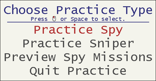 The Practice menu also features a "Preview Spy Missions" option. This displays a brief description of each mission, along with an animation of its corresponding tell, if applicable.
